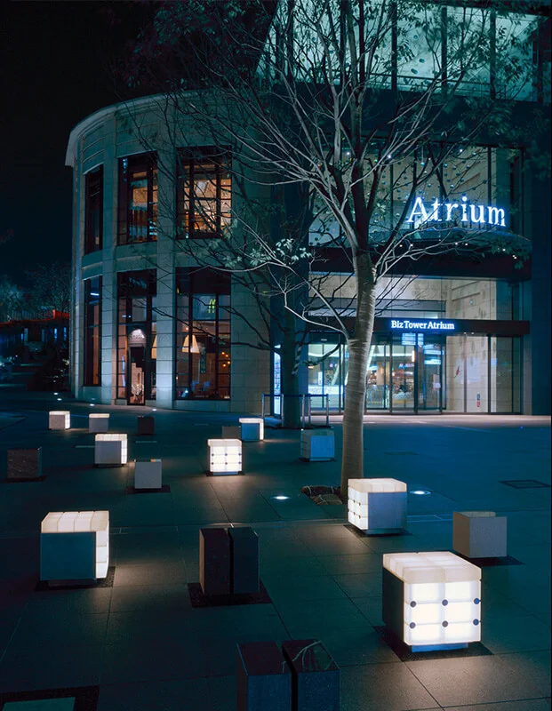 GlassOre glass bricks are used in interior and exterior applications in Akasaka Sacas to provide a glowing column and lighting for exte